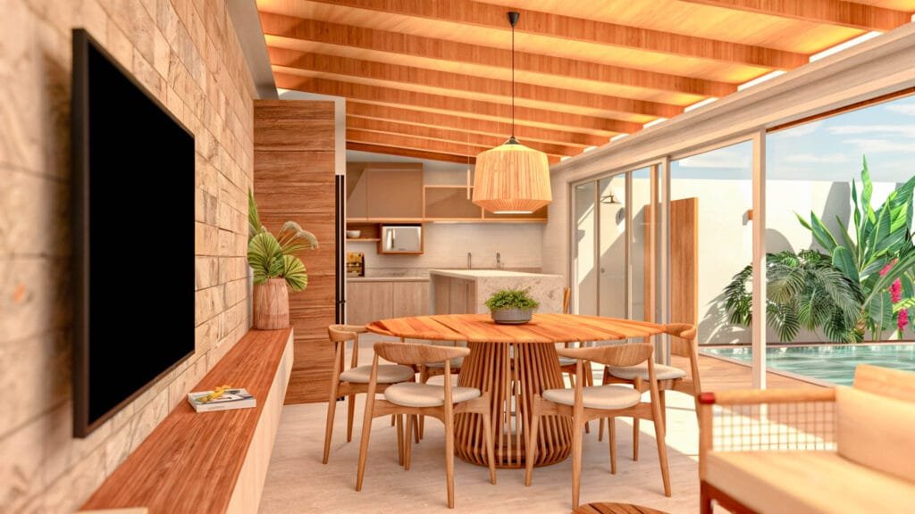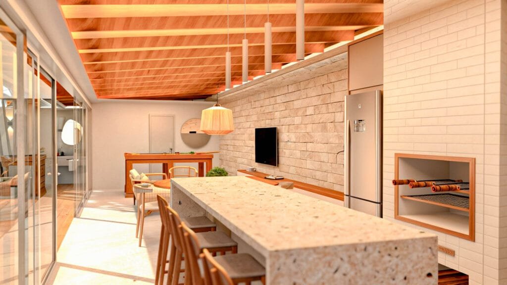 O projeto se destaca pela grande esquadria frontal, viabilizada por uma viga metálica de 11 metros, que permite abertura ampla e conexão direta com a área da piscina. Internamente, o ambiente integra ilha central, mesa de jantar, sala de estar e mesa de sinuca, configurando um espaço fluido e multifuncional. O fechamento lateral do terreno foi executado para garantir privacidade sem comprometer ventilação e iluminação natural, fundamentais no clima quente e úmido do litoral baiano.