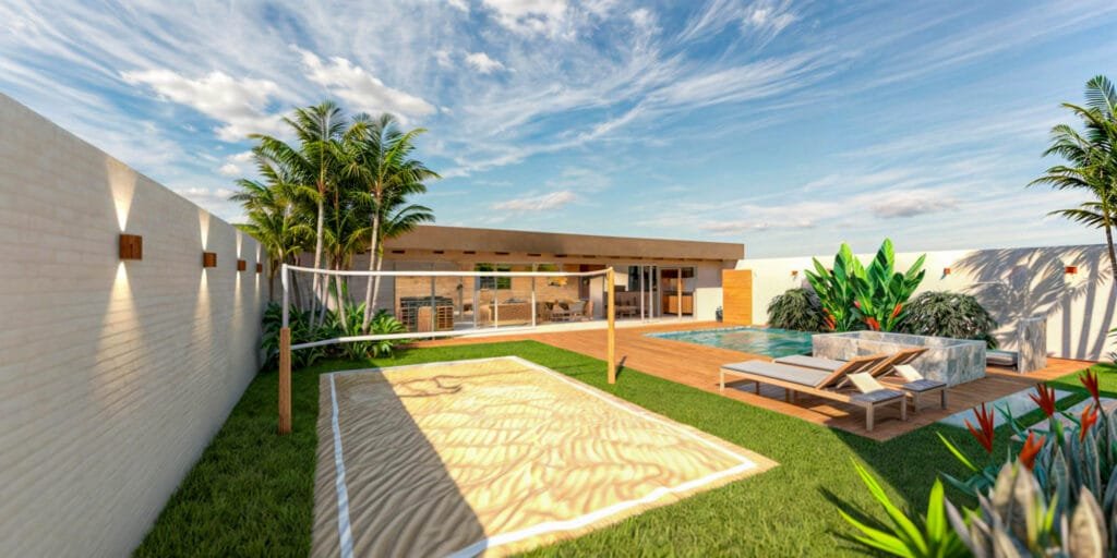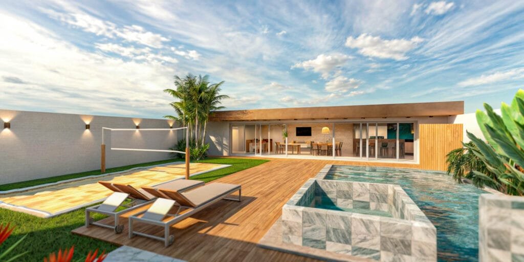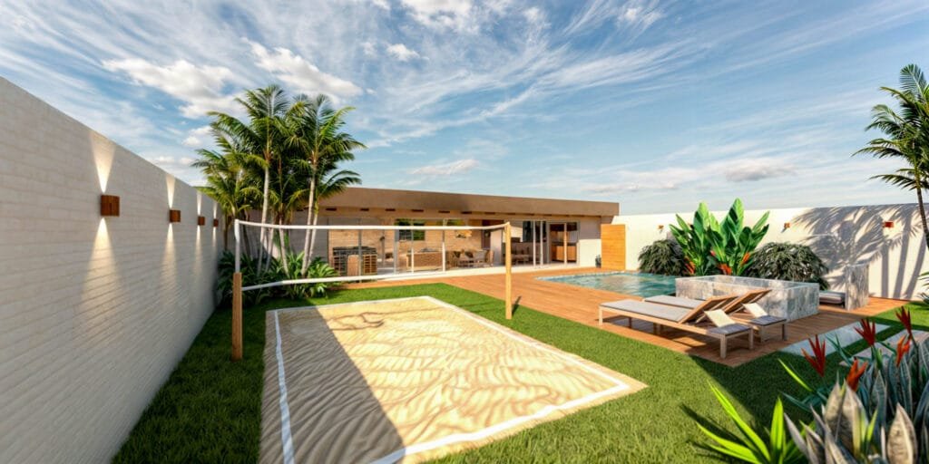 A cobertura foi executada com telha sanduíche (termoacústica), garantindo melhor desempenho térmico e conforto ambiental. À frente da área gourmet, a piscina em fibra de vidro foi revestida em cerâmica tipo pedrejal, agregando elegância e sofisticação ao conjunto. Essa solução reduz a necessidade de grandes estruturas em concreto moldado in loco, diminuindo custos, tempo de obra e impacto construtivo, sem abrir mão da qualidade estética. O lazer é complementado por uma meia quadra de vôlei, consolidando o espaço como núcleo de convivência ativa. O resultado é uma arquitetura leve, integrada e pensada para maximizar uso, conforto e eficiência em um contexto litorâneo.