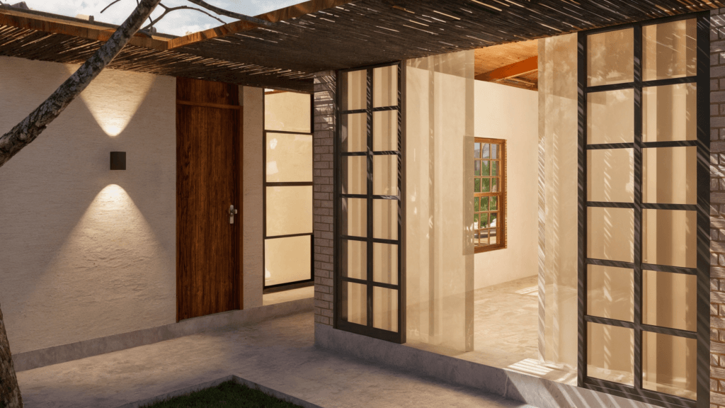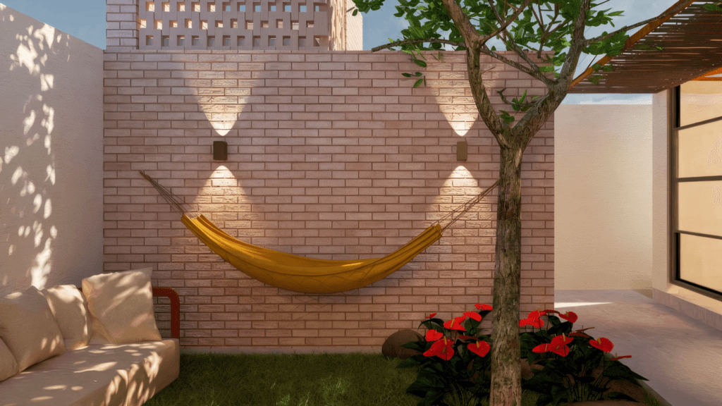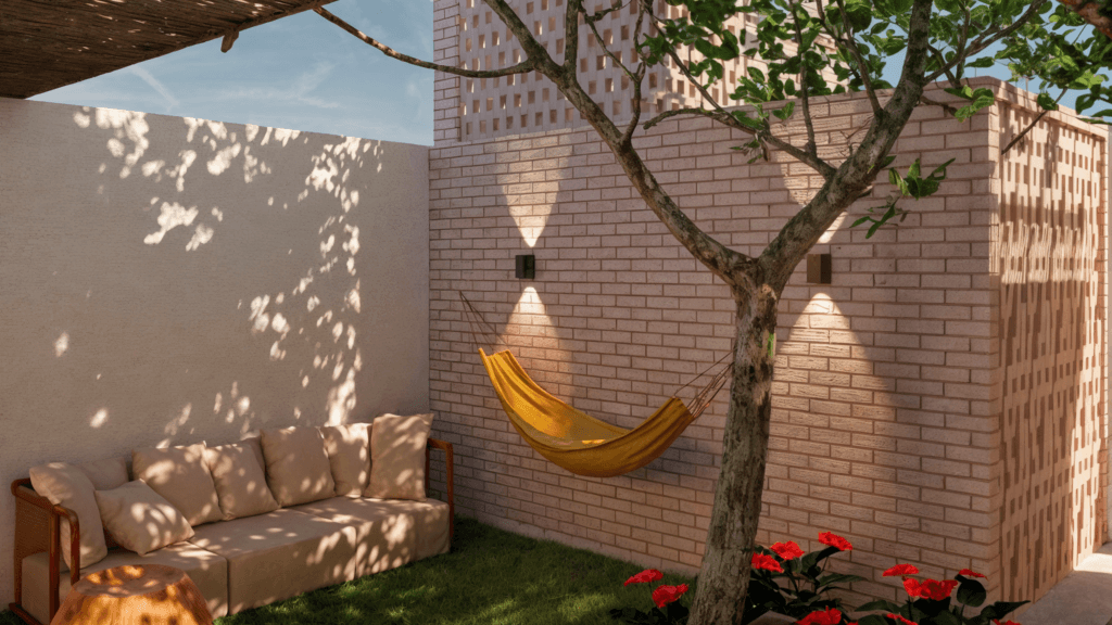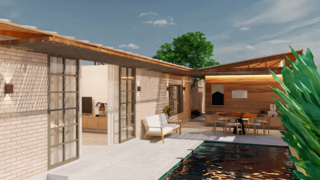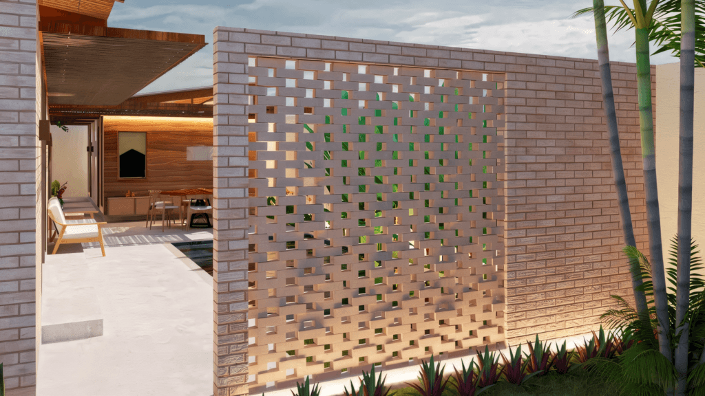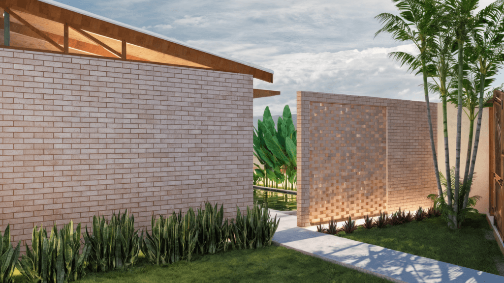 Executada predominantemente com tijolo ecológico, a residência também recebe trechos com acabamento em estuco branco, suavizando a presença do material e trazendo equilíbrio visual aos ambientes. Nos fundos, uma parede com elementos vazados oculta lavanderia, depósito e caixa d’água, mantendo ventilação constante. A casa conta com biodigestor, cobertura com telha sanduíche (termoacústica) e sistema de placas solares, reforçando o compromisso com eficiência energética e desempenho ambiental. A Casa Taipa traduz uma arquitetura contemporânea com raízes brasileiras, onde materialidade, clima e modo de viver se encontram de forma sensível e estratégica.