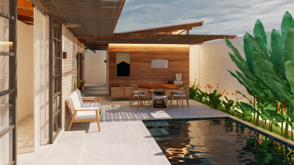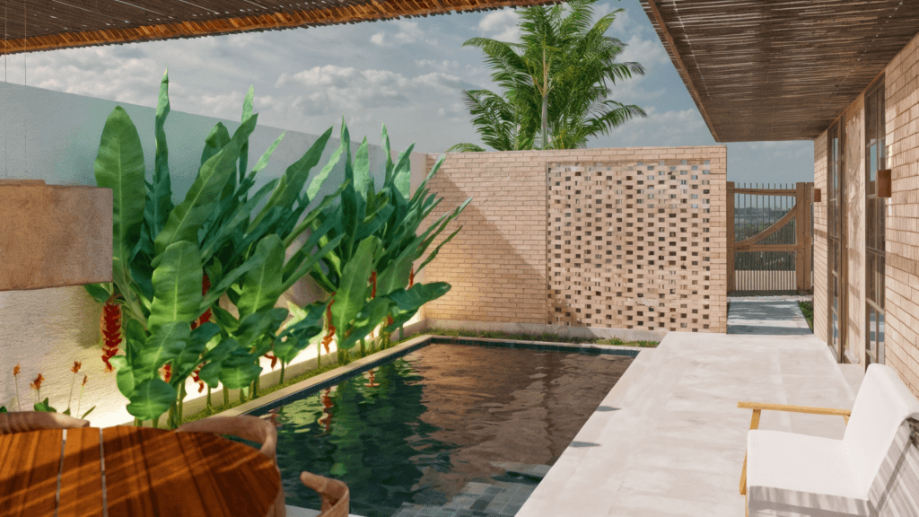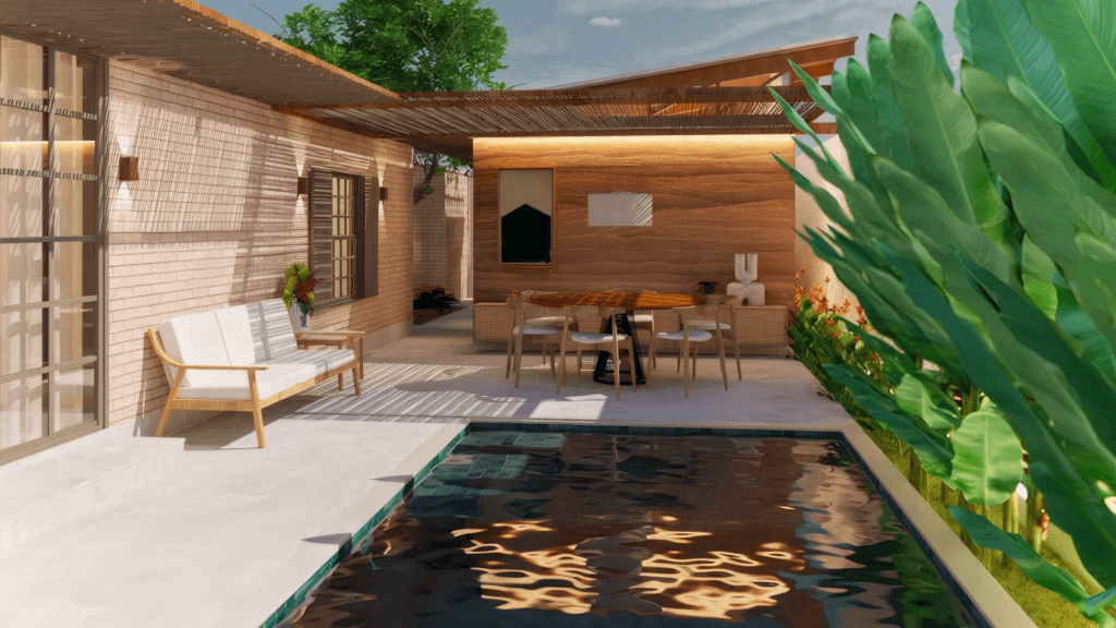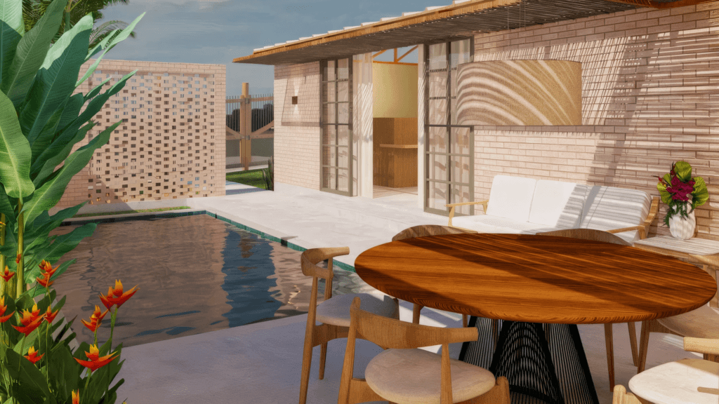 A Casa Taipa, em Itacimirim – BA, é uma residência térrea pensada como refúgio litorâneo, onde a arquitetura se fecha para a rua e se abre generosamente para o interior do lote. Dividida em dois módulos conectados por um pergolado, a casa cria uma atmosfera de acolhimento e introspecção. A entrada é marcada por uma parede cega e por um elemento em cobogó que garante privacidade à área da piscina. Ao atravessar esse limite, revela-se o coração do projeto: a piscina integrada ao jardim e à sala de jantar externa.