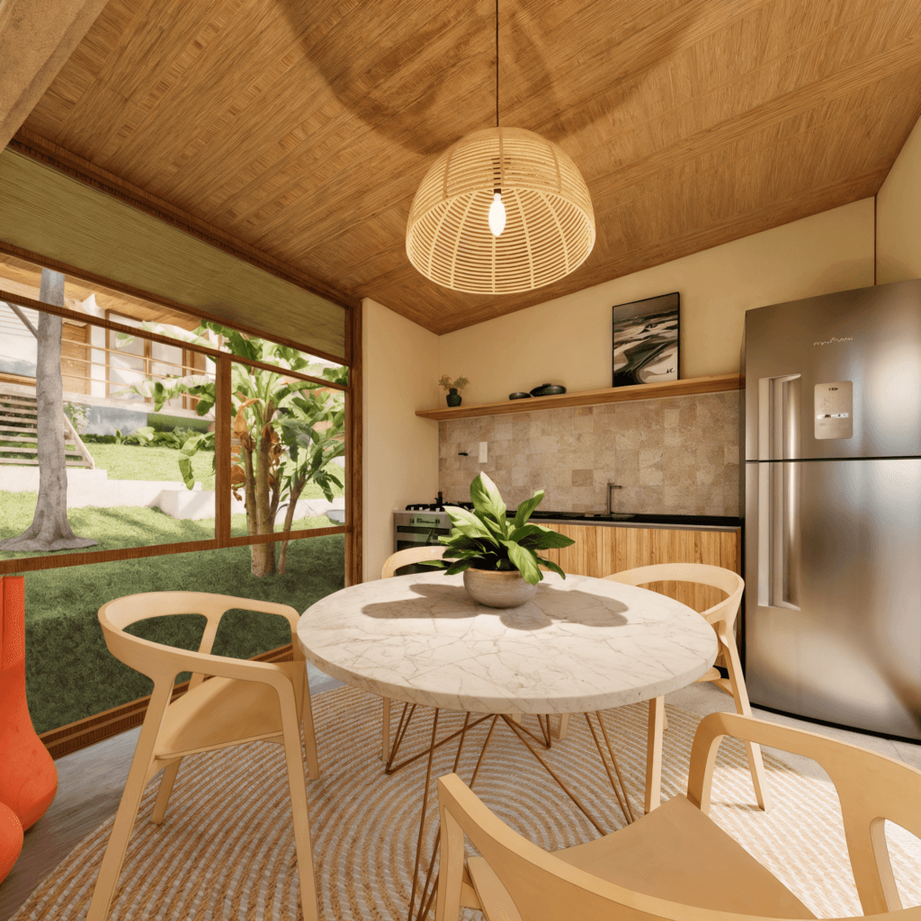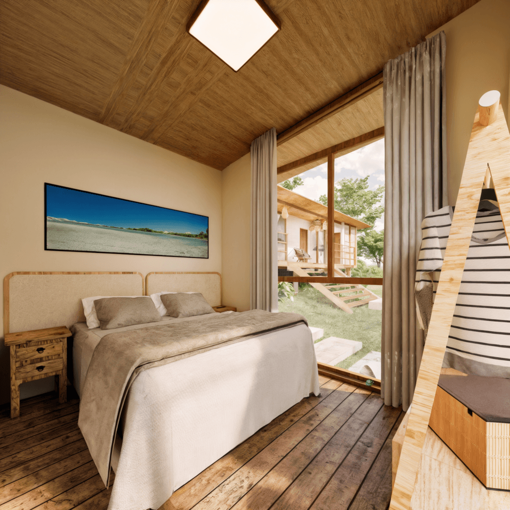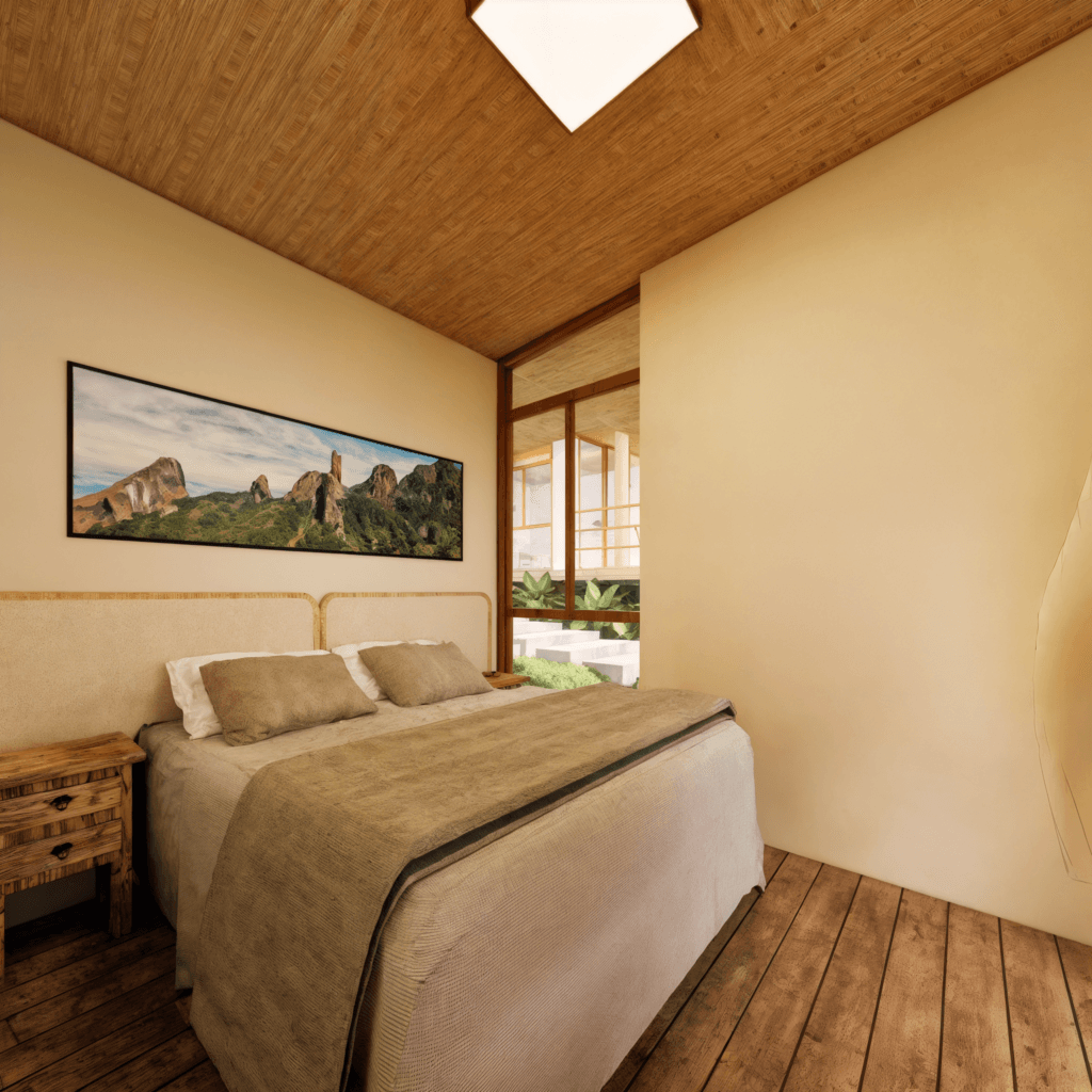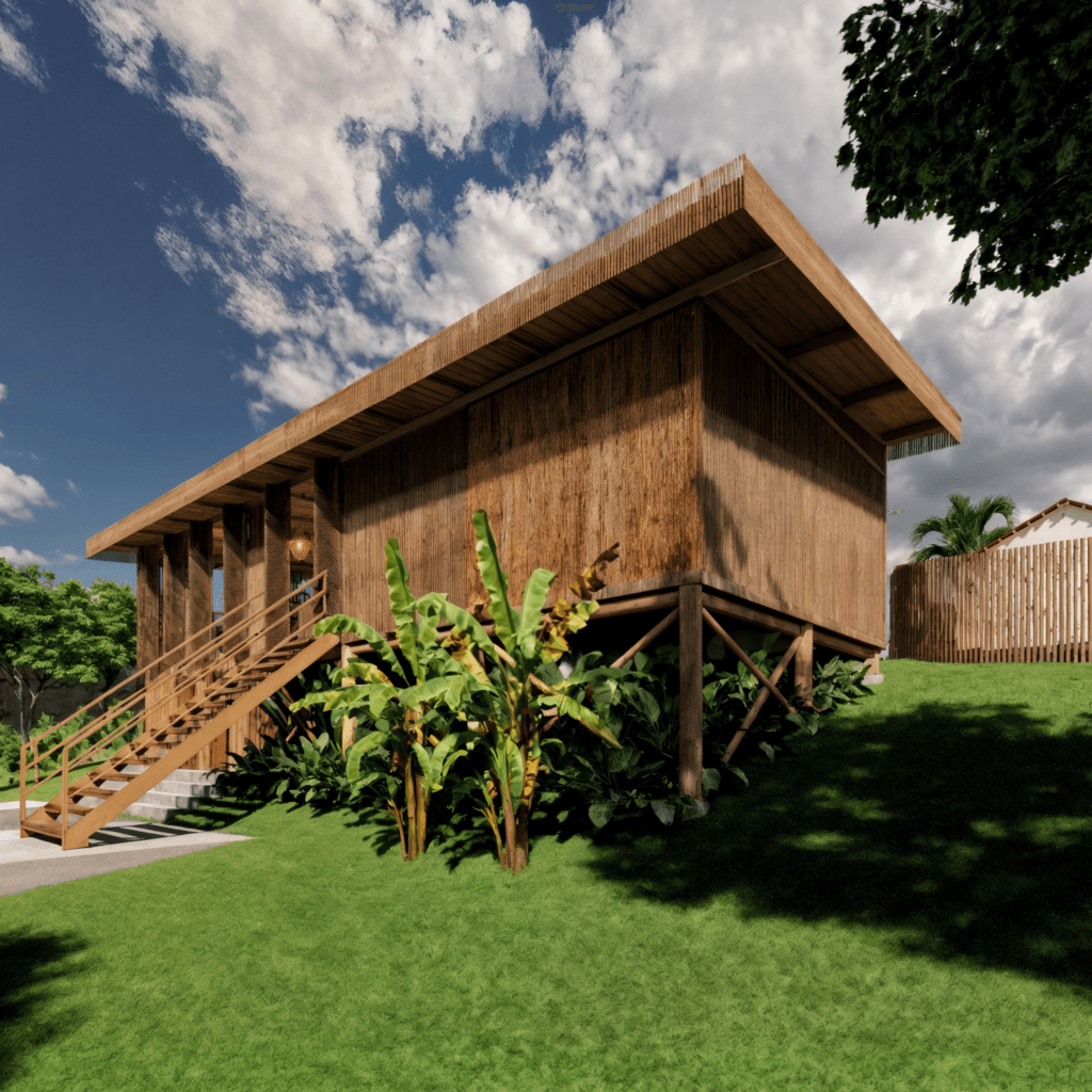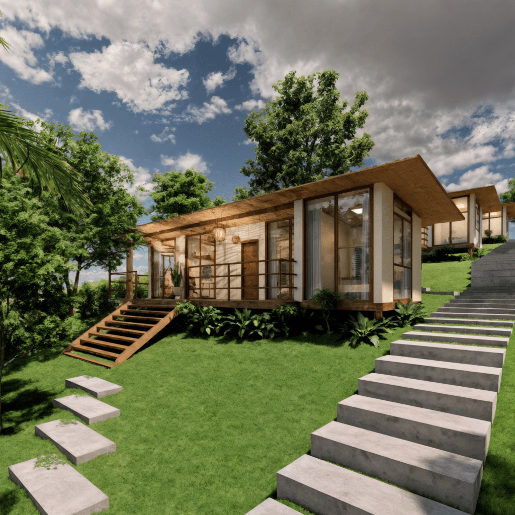 Neste projeto comercial, a arquitetura sustentável alia funcionalidade e viabilidade econômica. A proposta atende às demandas do cliente por hospedagem, café da manhã e espaços terapêuticos coletivos, utilizando soluções inteligentes que priorizam a economia de recursos, o conforto e a identidade visual.
