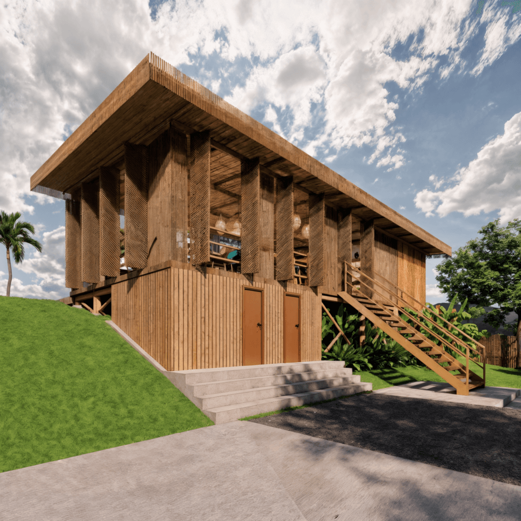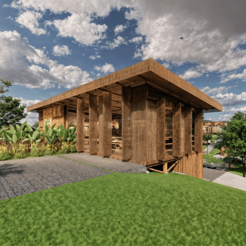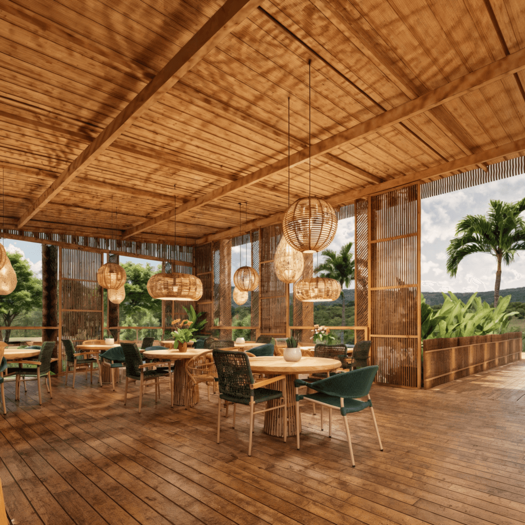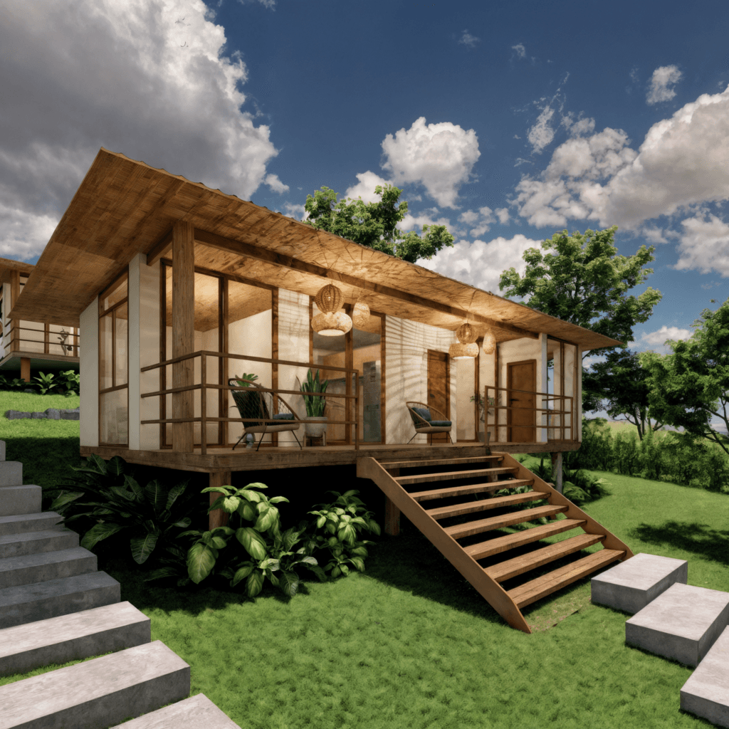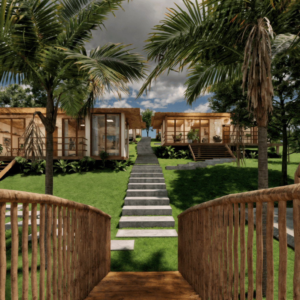 Neste projeto comercial, a arquitetura sustentável alia funcionalidade e viabilidade econômica. A proposta atende às demandas do cliente por hospedagem, café da manhã e espaços terapêuticos coletivos, utilizando soluções inteligentes que priorizam a economia de recursos, o conforto e a identidade visual.