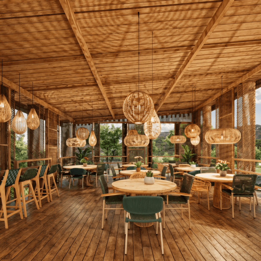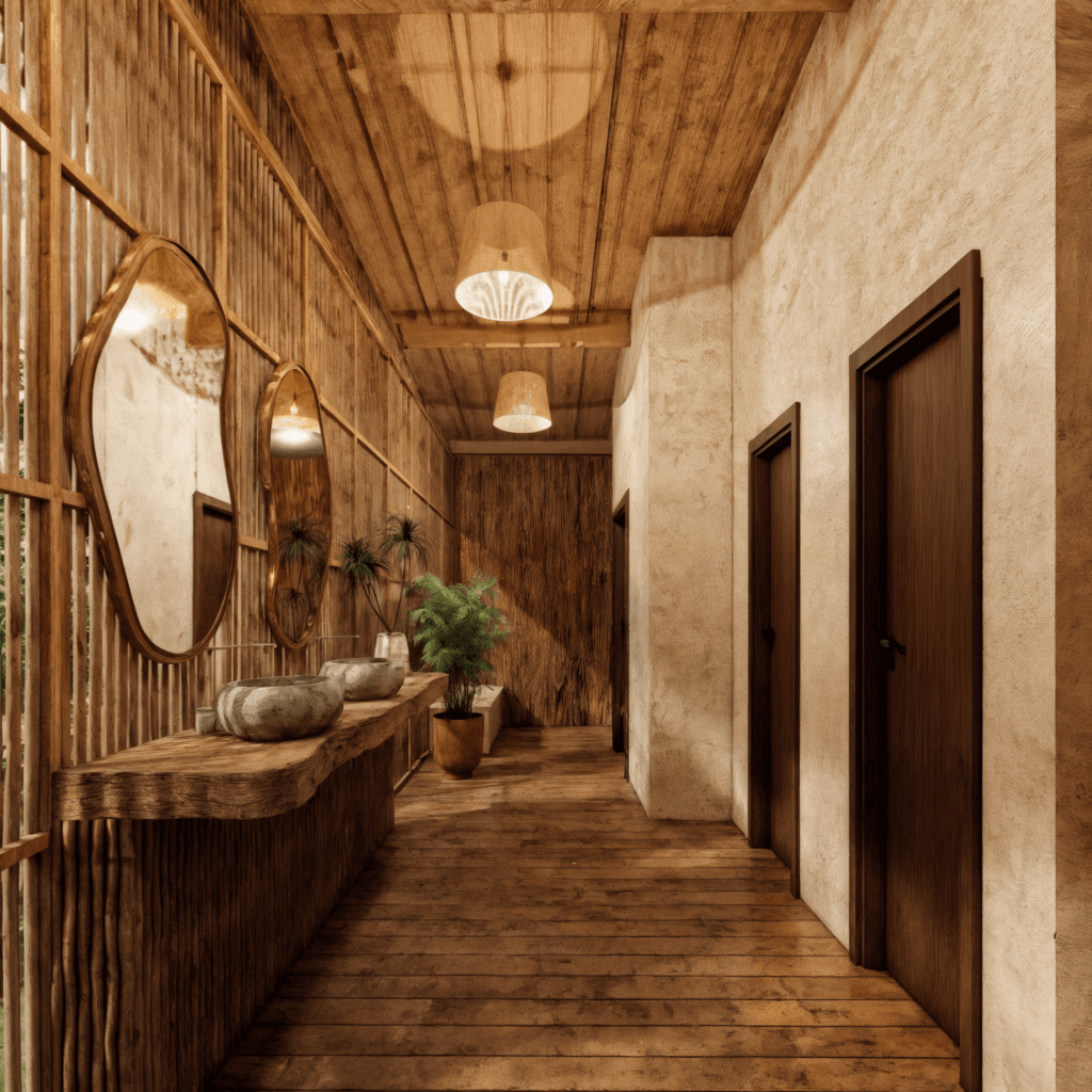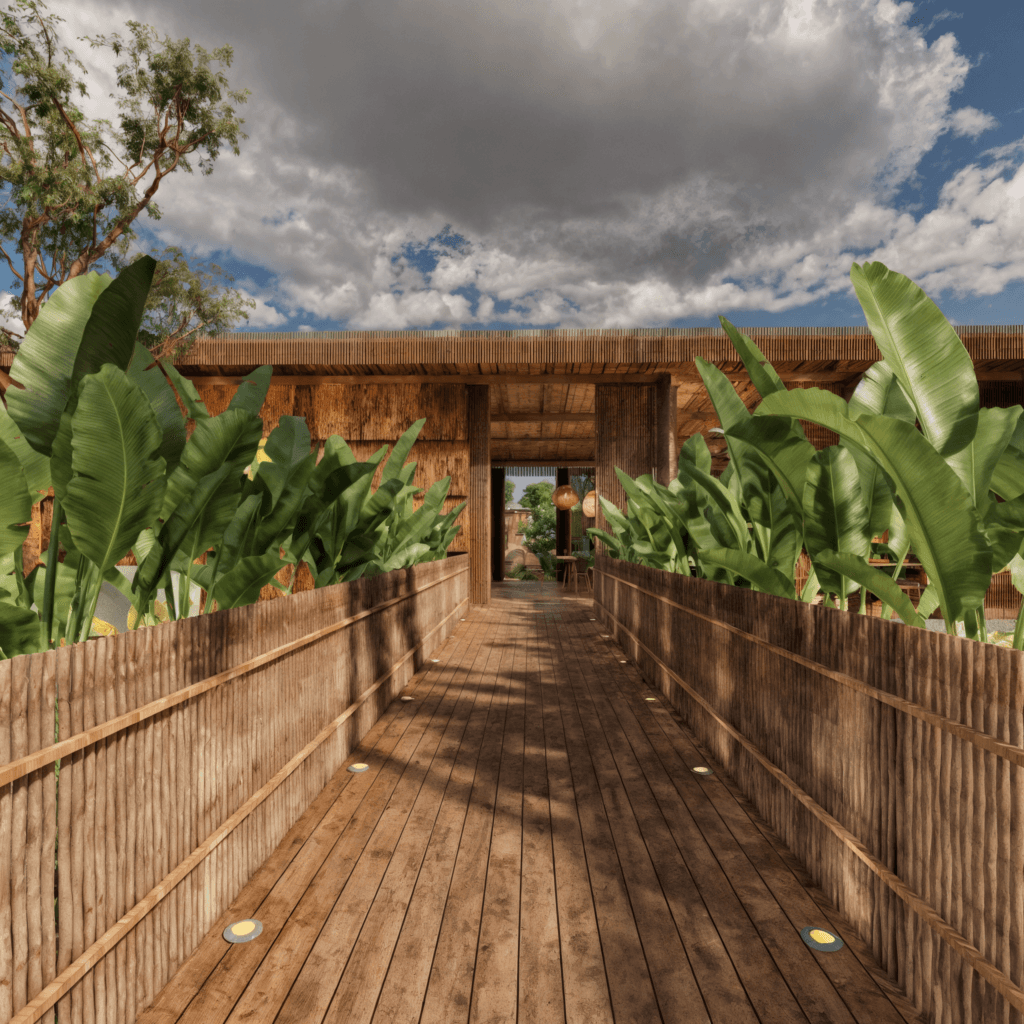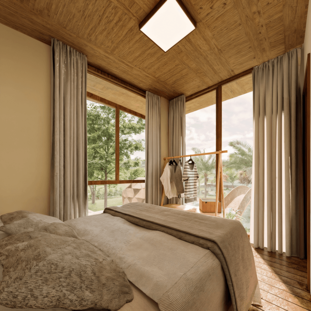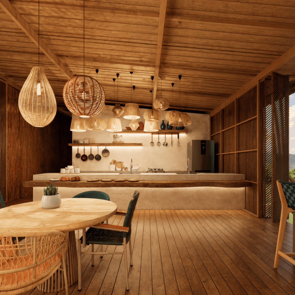 Neste projeto comercial, a arquitetura sustentável alia funcionalidade e viabilidade econômica. A proposta atende às demandas do cliente por hospedagem, café da manhã e espaços terapêuticos coletivos, utilizando soluções inteligentes que priorizam a economia de recursos, o conforto e a identidade visual.