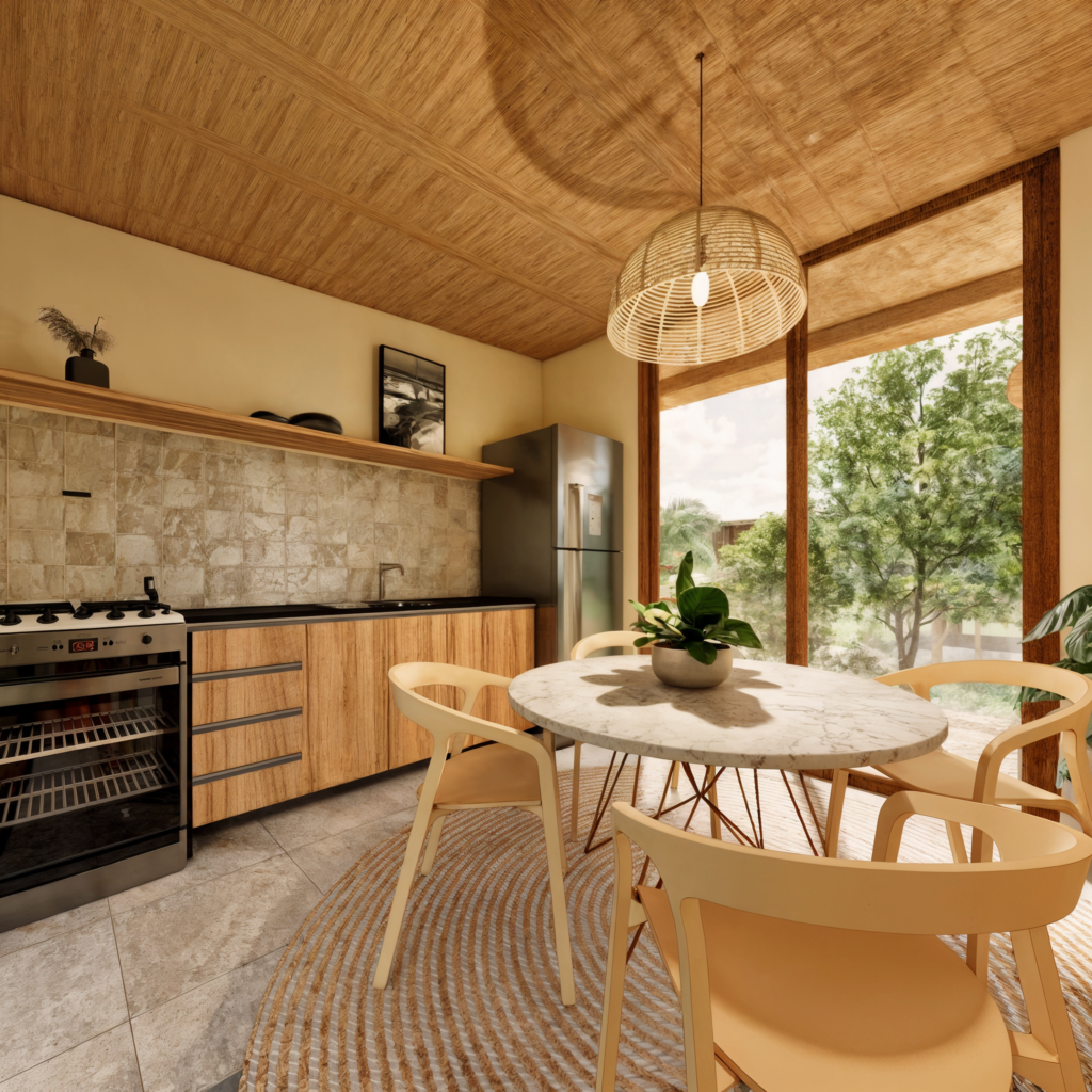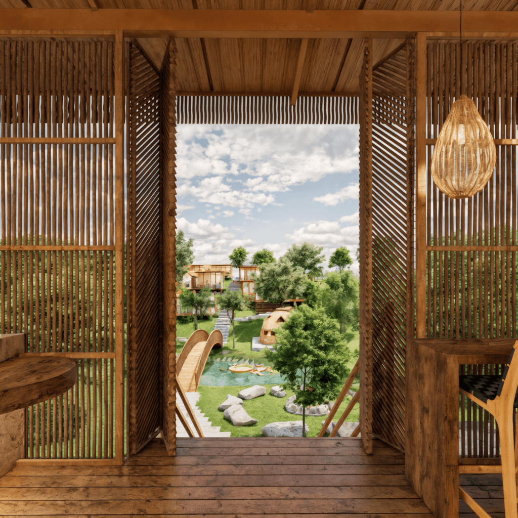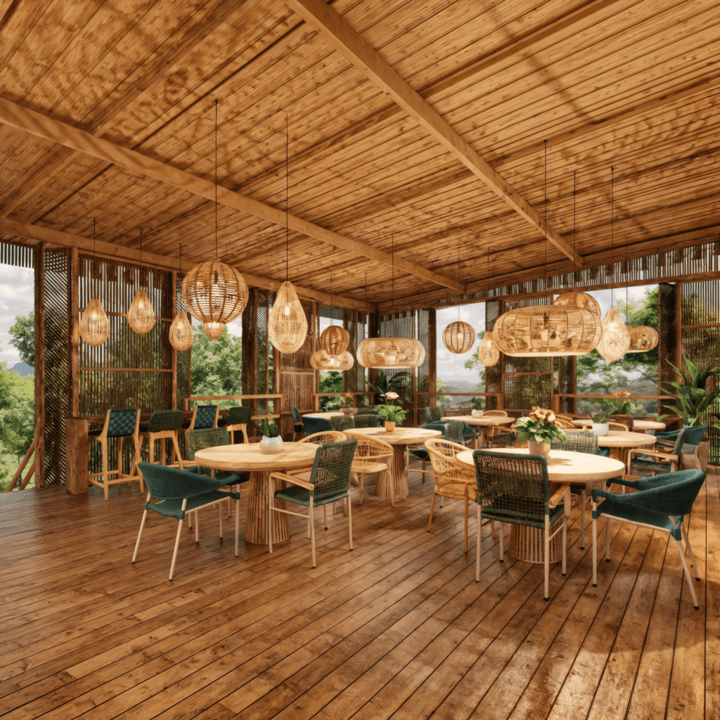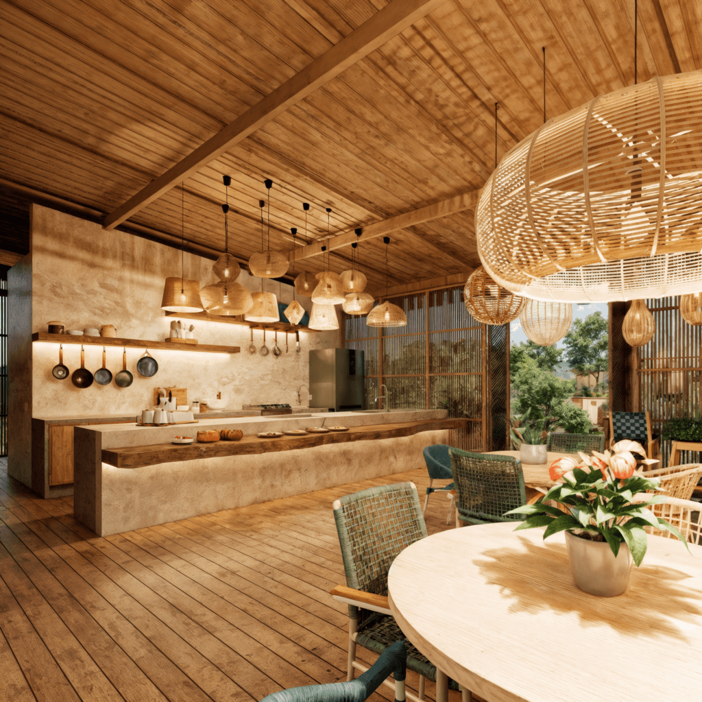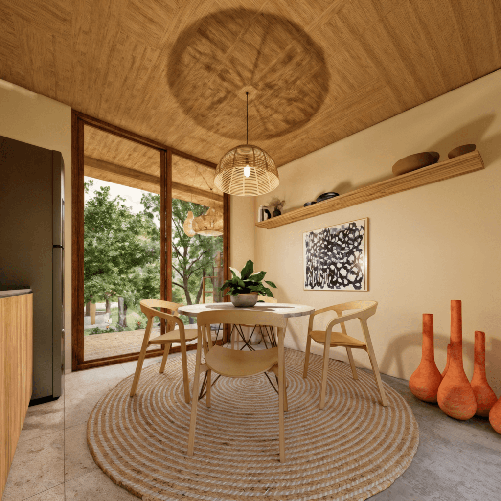 Neste projeto comercial, a arquitetura sustentável alia funcionalidade e viabilidade econômica. A proposta atende às demandas do cliente por hospedagem, café da manhã e espaços terapêuticos coletivos, utilizando soluções inteligentes que priorizam a economia de recursos, o conforto e a identidade visual.