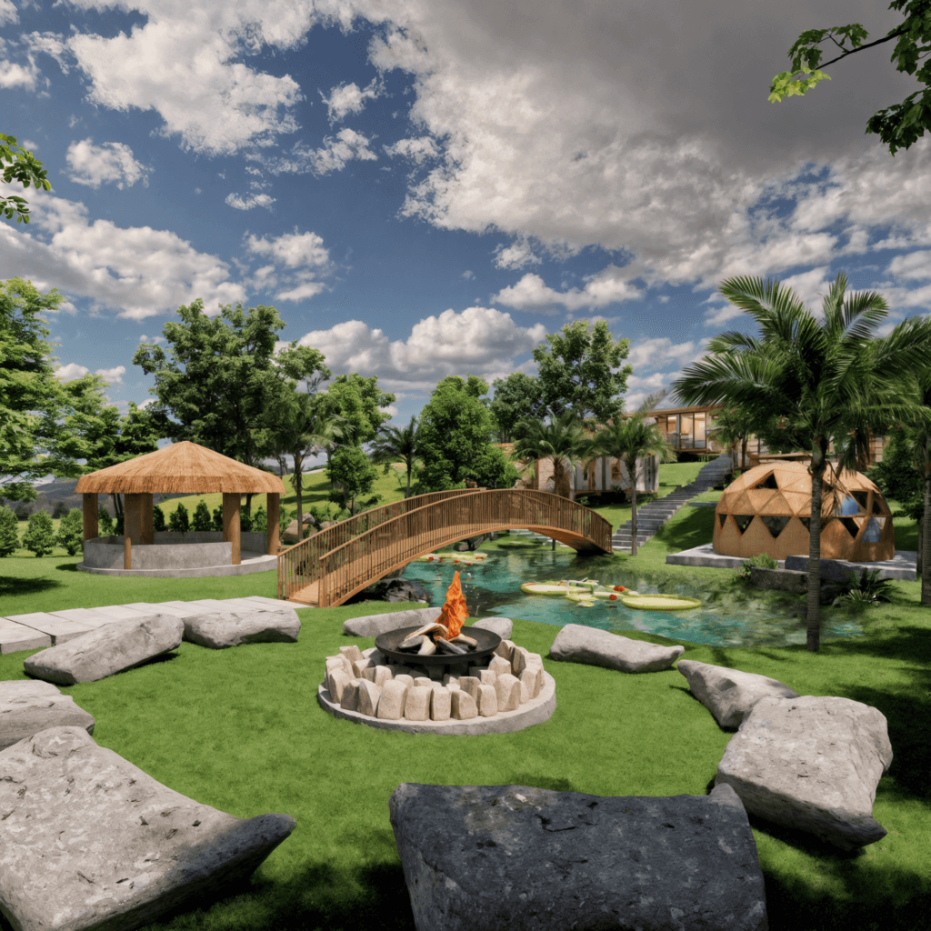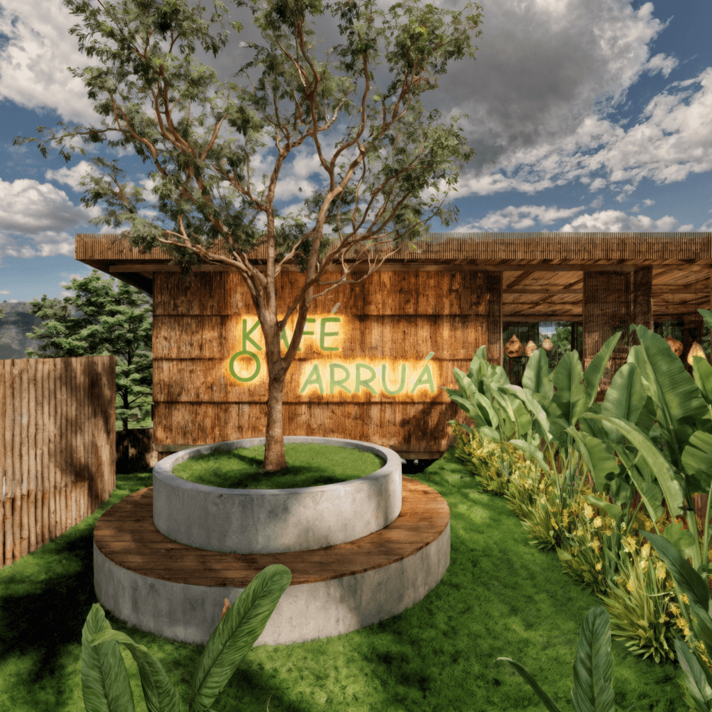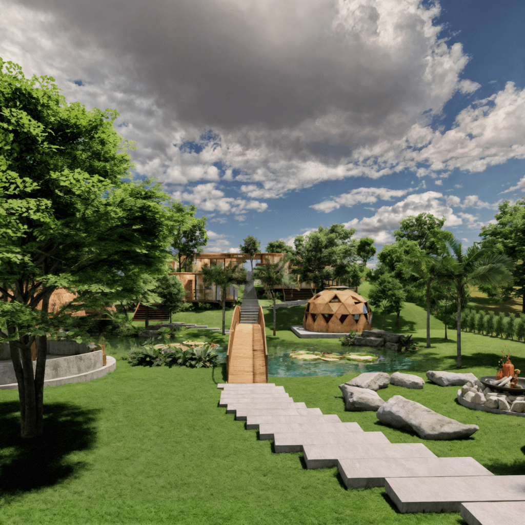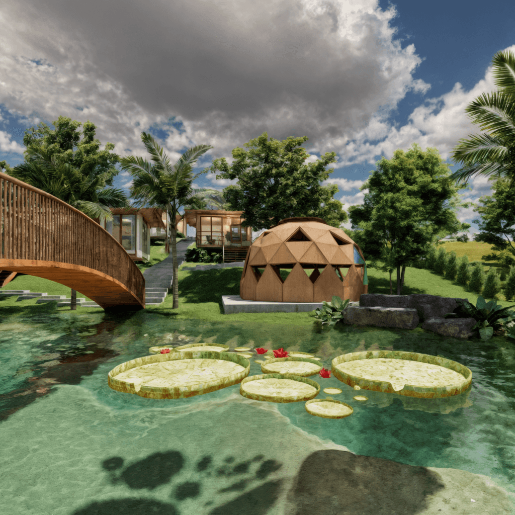 Implantado respeitando o terreno natural, sem movimentação de solo, o Espaço Okura se adapta ao aclive e declive existentes, preservando o máximo de árvores possível. Logo na entrada, um espaço para o café da manhã, construído em madeira e tijolos ecológicos, com fechamento em biriba e telhado termoacústico, recebe hóspedes e visitantes em um amplo salão com buffet de autosserviço. Ao longo do percurso, o terreno revela um lago natural, uma ponte de travessia, uma oca, um círculo de fogo e uma cúpula geodésica destinada às vivências, cuja geometria sagrada potencializa a experiência sensorial e energética do espaço.
