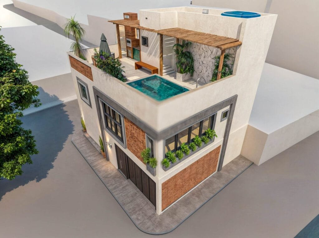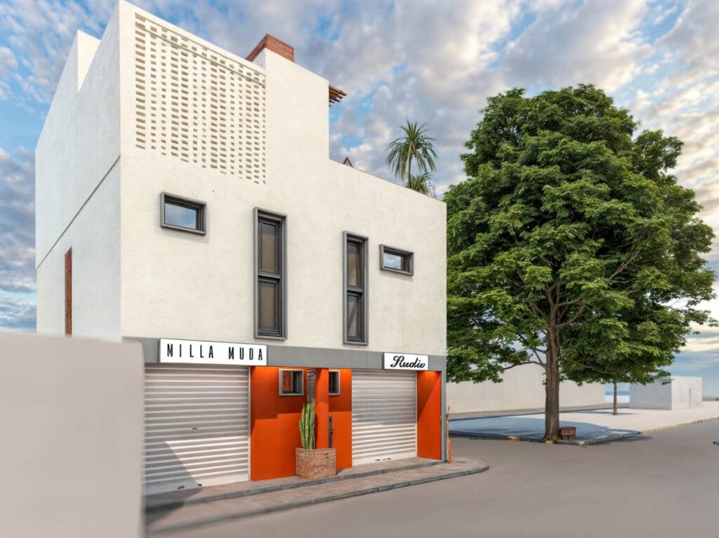 A arquitetura sustentável une funcionalidade, geração de renda e estratégias bioclimáticas nesta Casa e Comercial em Barra do Mendes – BA. Em lote compacto, o projeto integra duas lojas térreas e residência completa com terraço e piscina, utilizando adobe, cobogó e soluções para conforto térmico no clima quente da região.