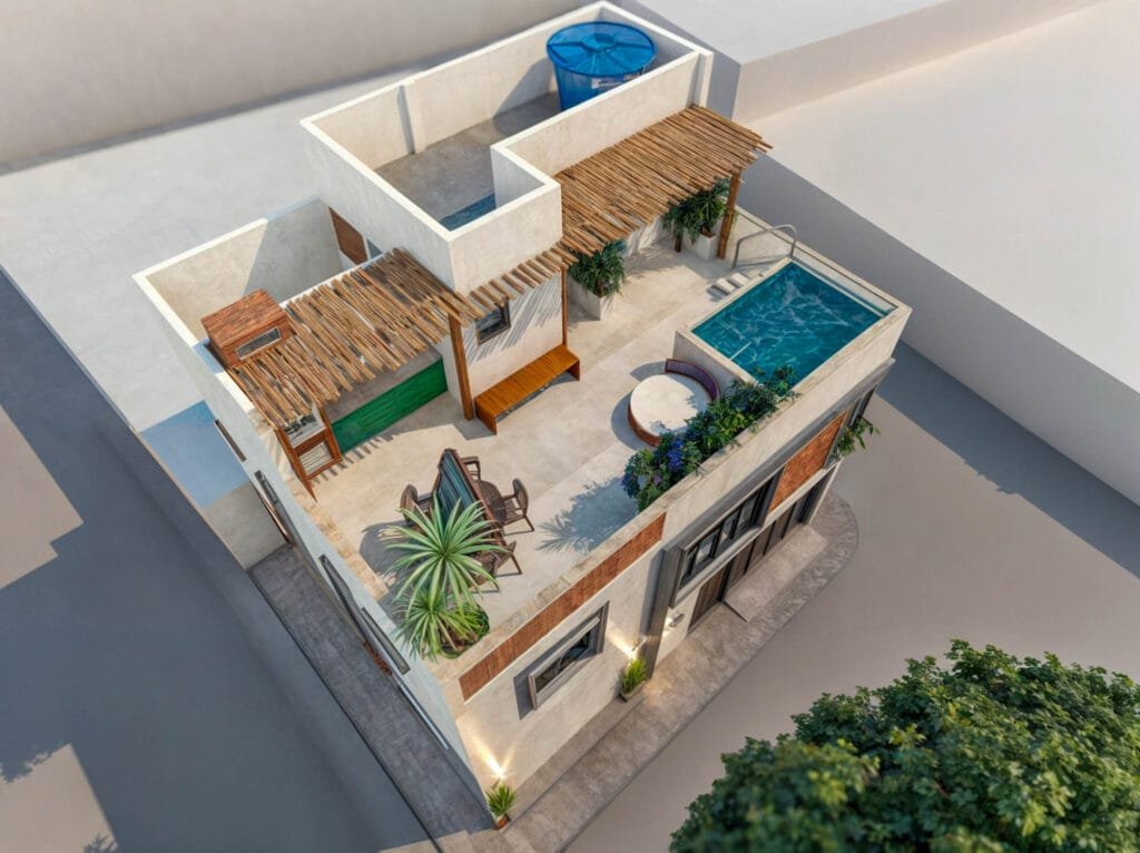 A escolha dos materiais respeitou a realidade local. A estrutura principal foi executada com bloco de concreto, amplamente disponível na região, evitando impactos ambientais com transporte de longas distâncias. No entanto, o projeto incorporou paredes em adobe e cobogós de adobe, resgatando técnicas construtivas ancestrais e garantindo maior conforto térmico. A parede da garagem, parte da sala e elementos do terraço utilizam esse material mais fresco e eficiente. No último pavimento, o terraço abriga piscina, lavanderia e uma área gourmet com cobertura em biribas, criando um contraste tropical que suaviza o cenário seco da Chapada Velha. A Casa e Comercial em Barra do Mendes demonstra que é possível unir tradição, rentabilidade e conforto ambiental em um único projeto arquitetônico.